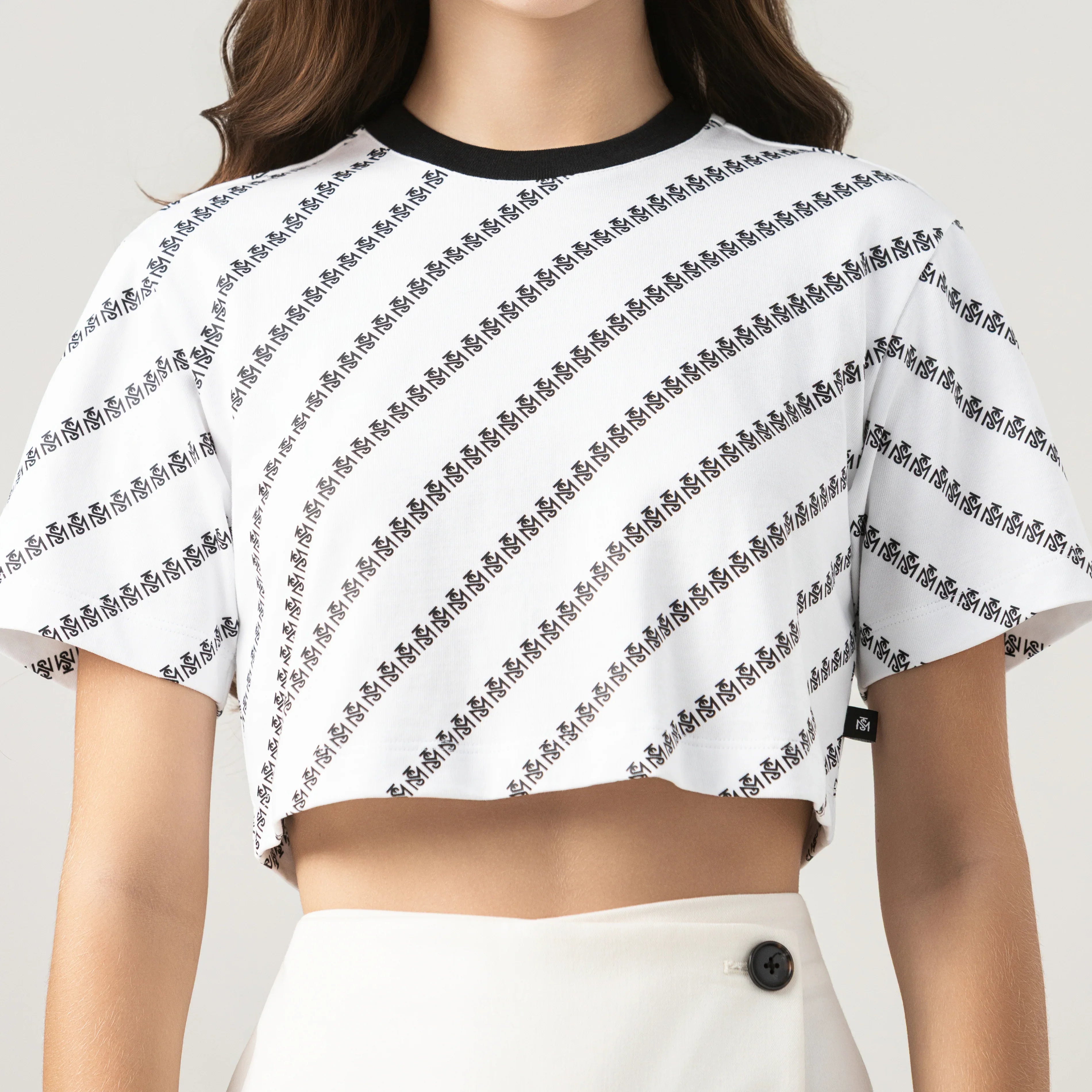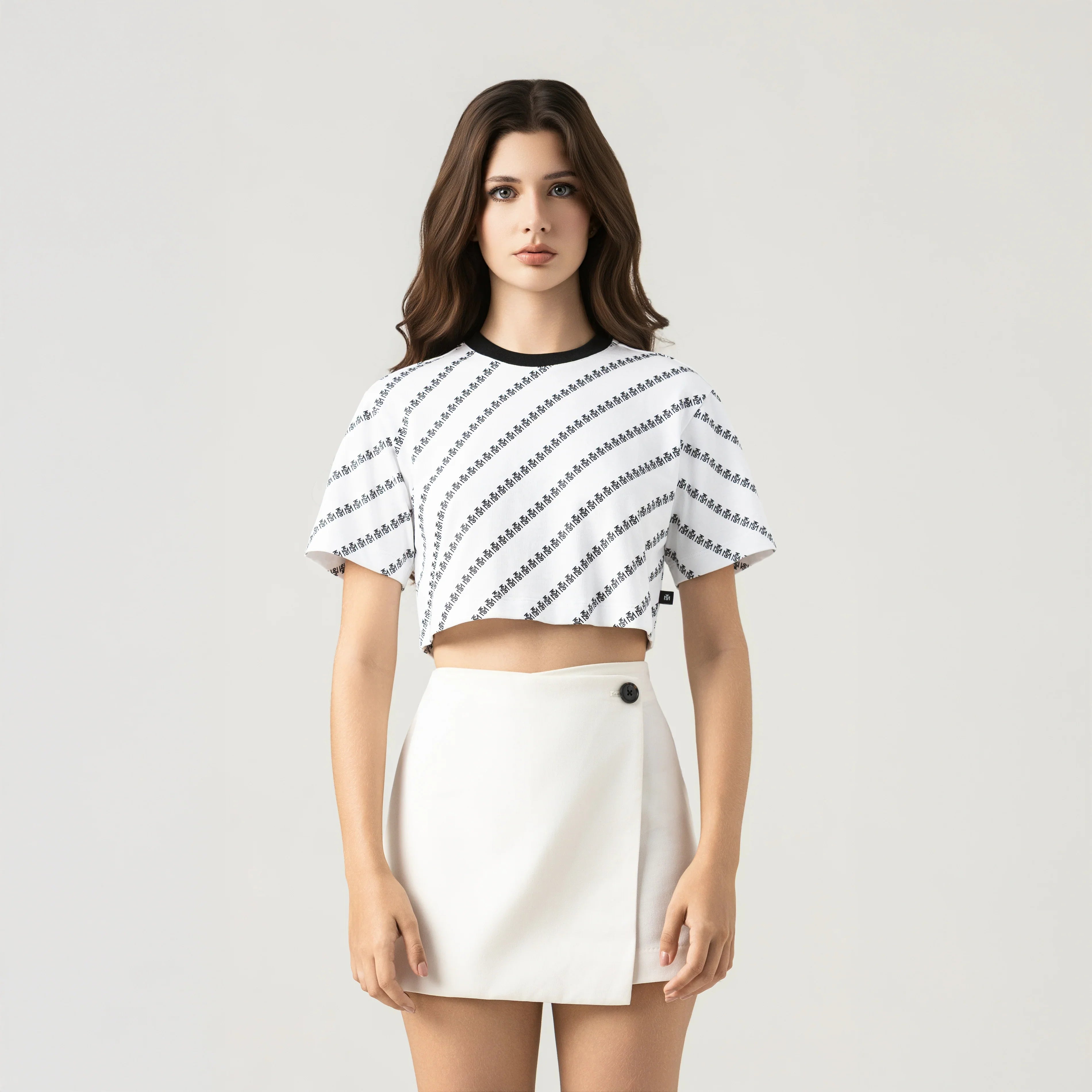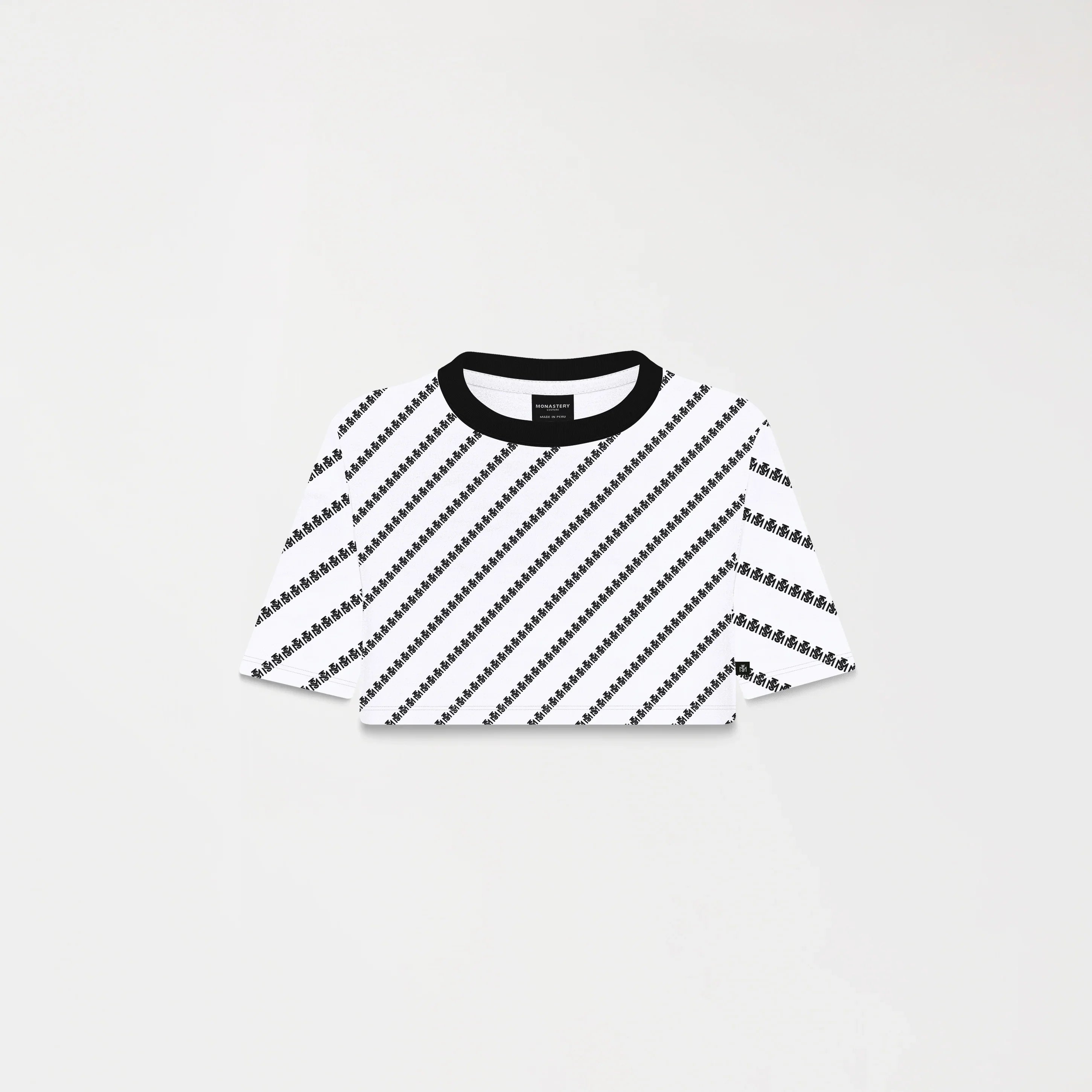 Britania es un crop top femenino confeccionado en algodón 100% exclusivo de Monastery. Su silueta pequeña se complementa con un fondeo total del logo TSM en repetición diagonal, creando un patrón dinámico y envolvente. El contraste de colores entre fondo y logotipo aporta fuerza visual, convirtiéndolo en una pieza ideal para quienes buscan estilo con personalidad.