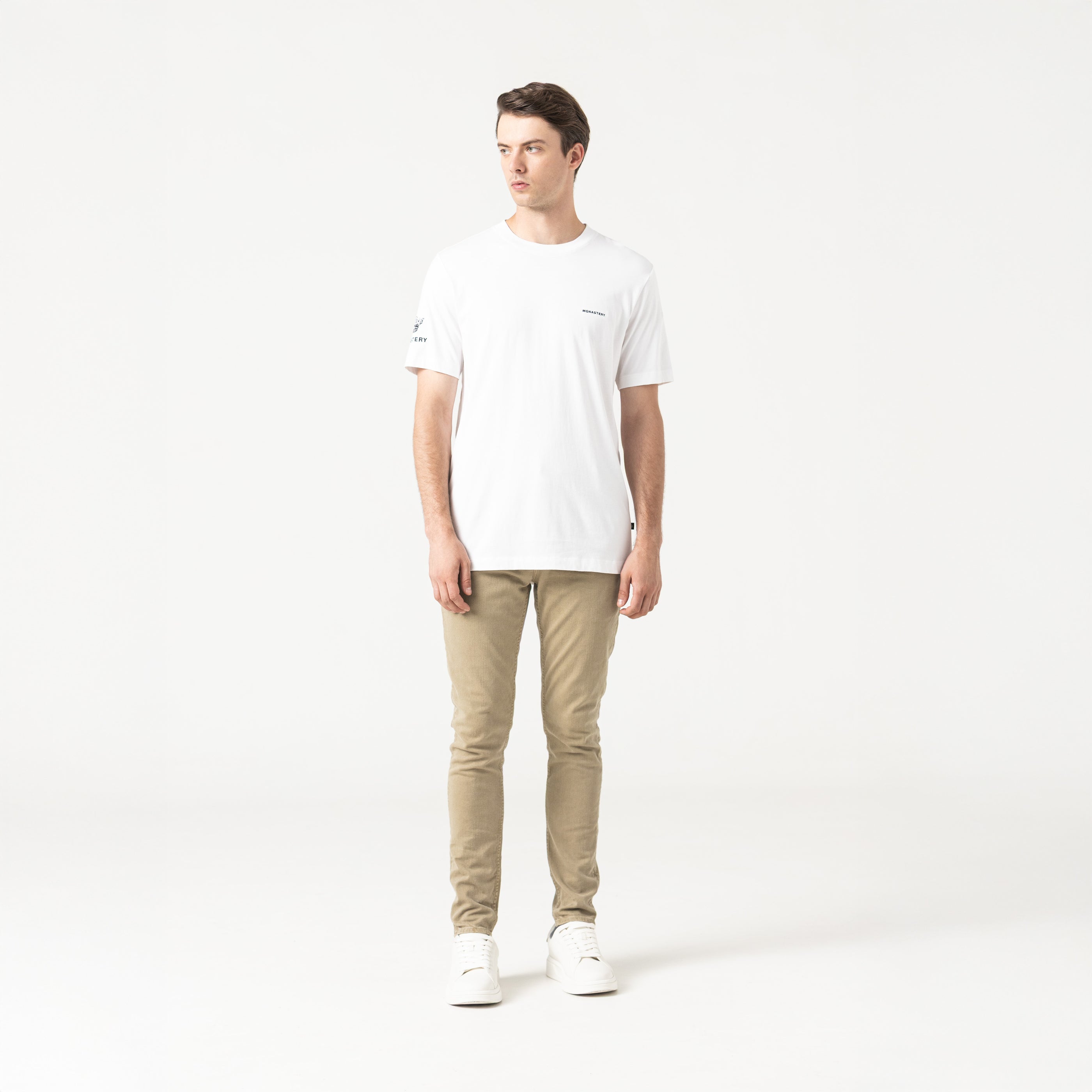 Brunar es una t-shirt masculina en silueta regular con un cuello de 2,5 cm elaborada en algodón 100% pima peruano exclusivopara Monastery. En cuanto a las técnicas de diseño en la manga lado derecho de la prenda presenta una técnica de bordadoplano creando un efecto sutil y elegante, añadiendo textura sin ser demasiado recargado, lo que resalta el diseño y aporta untoque único a la prenda. En la espalda, se combinan dos técnicas: plastisol y bordado plano complementando el diseño con untoque de textura y volumen, creando un contraste interesante con el plastisol y aportando un estilo dinámico y contemporáneoa la t-shirt. Este diseño con múltiples técnicas permite una prenda versátil, moderna y de alta calidad, con detallescuidadosamente trabajados que la hacen destacar sin perder la comodidad y la simplicidad de una t-shirt clásica.