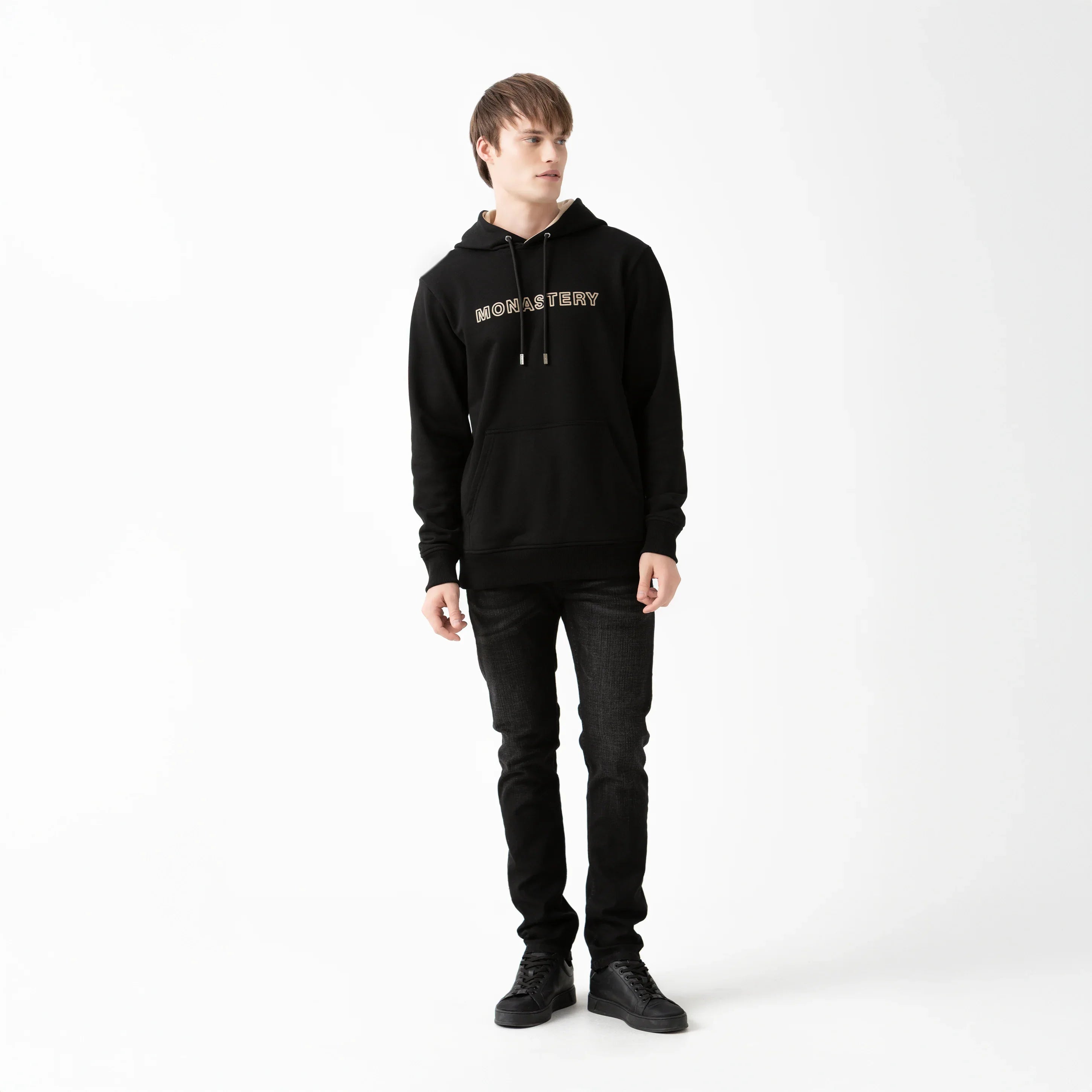 Hoodie masculino confeccionado en French Terry de alta calidad en color negro, que ofrece confort, estructura y estilo contemporáneo.