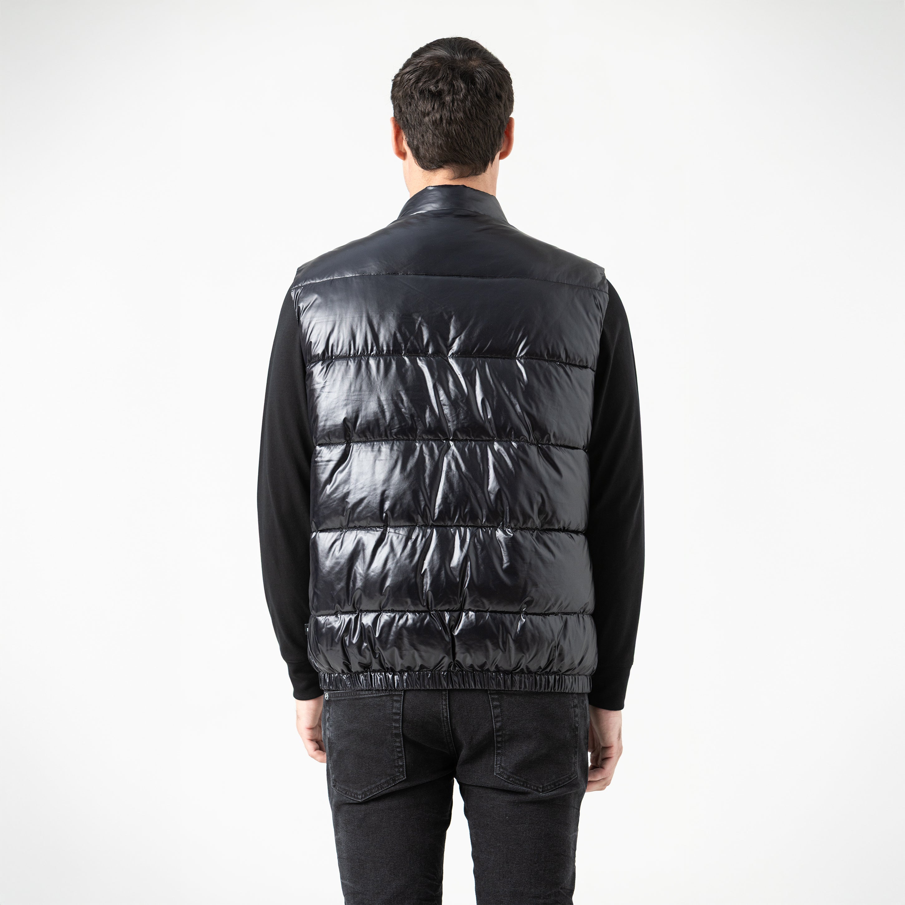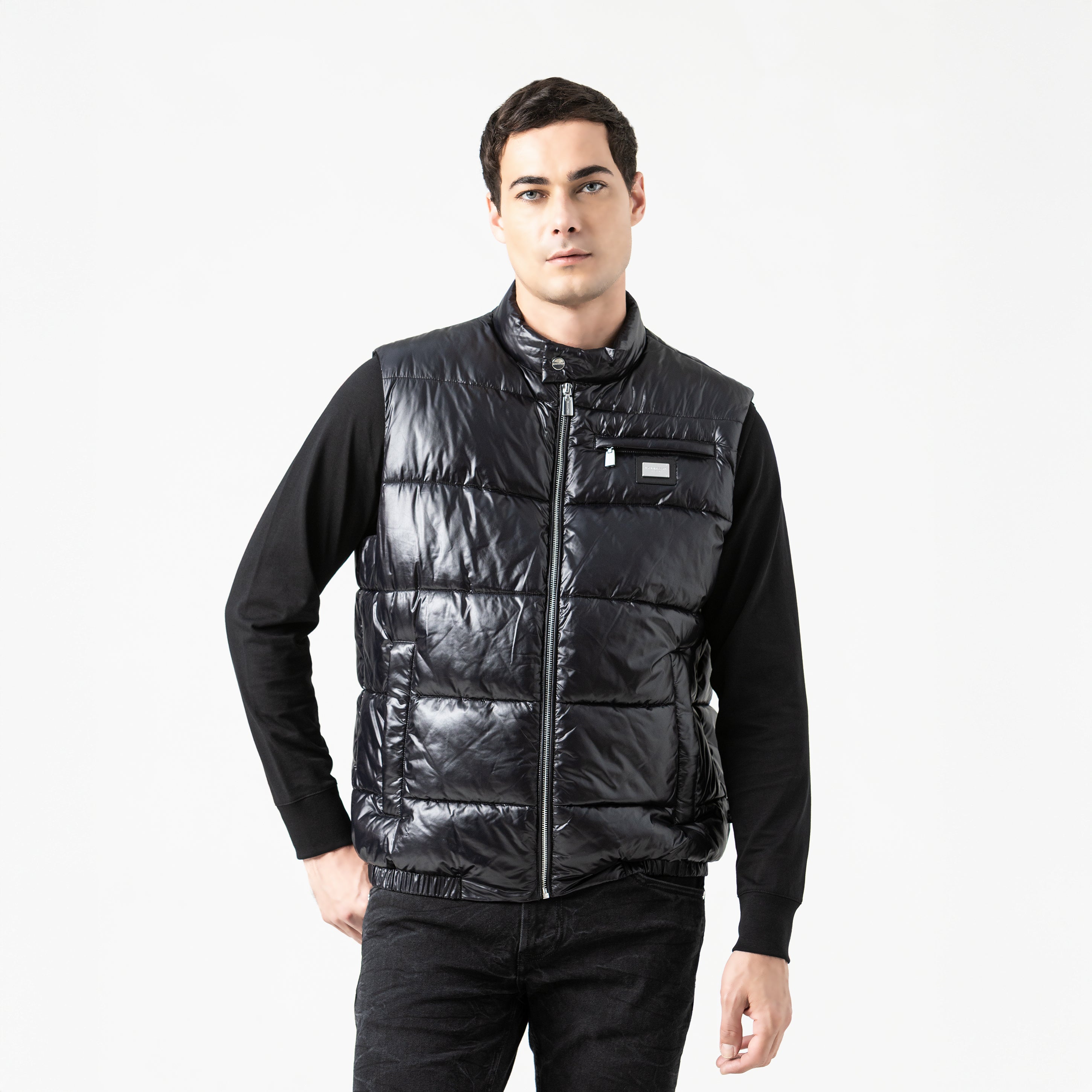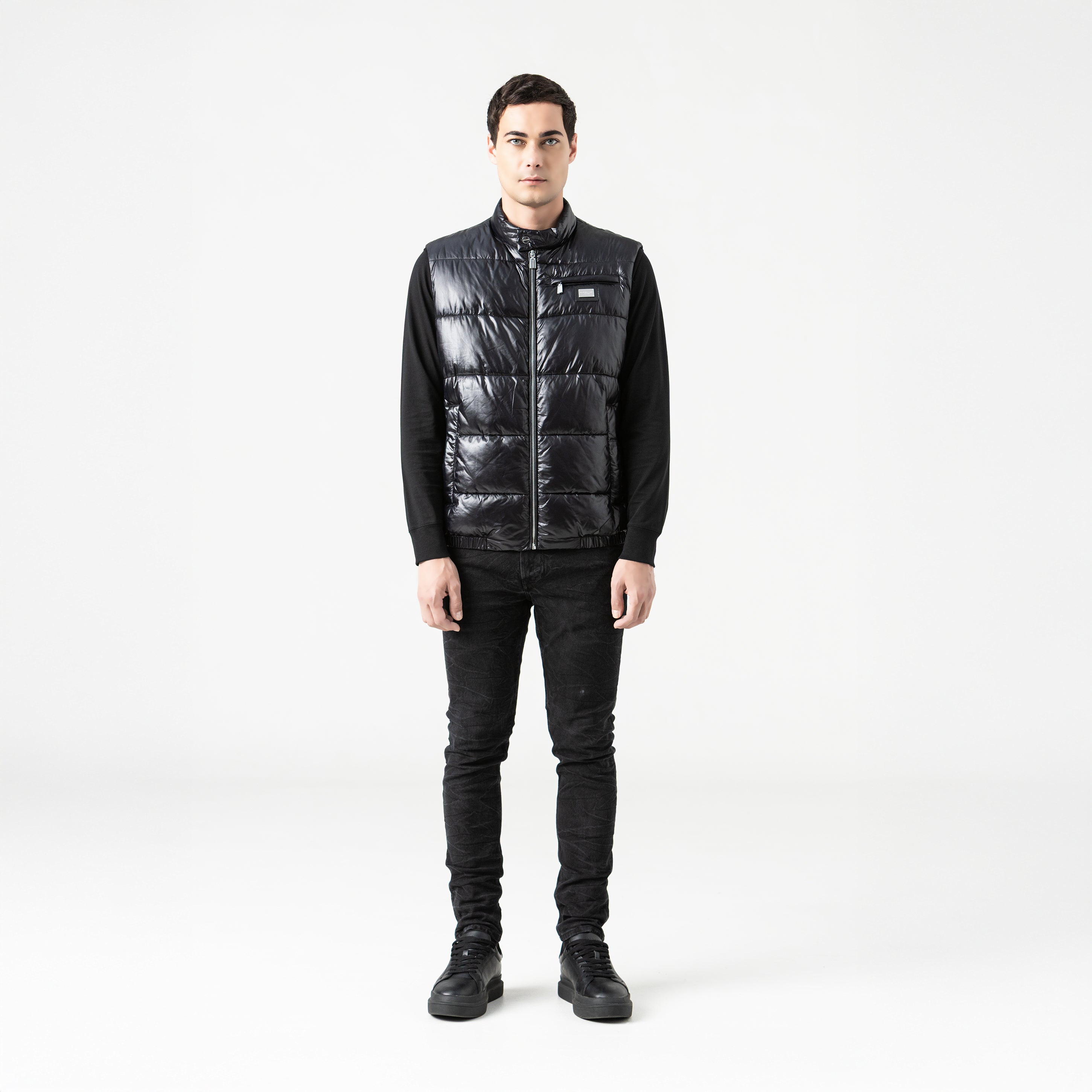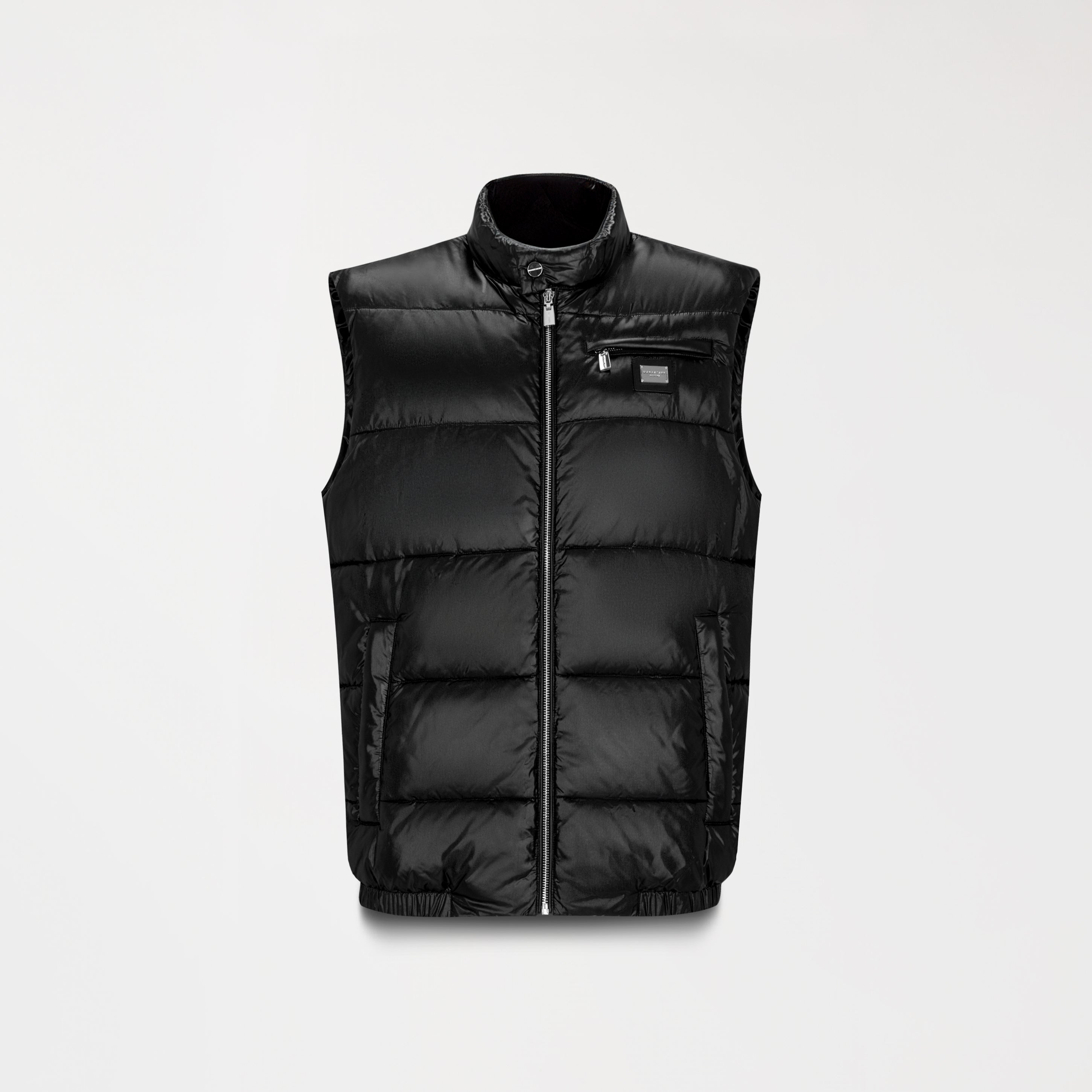 Chaleco negro de silueta abullonada, ideal para complementar looks urbanos con estilo y funcionalidad. Cuenta con aplique metálico en la parte delantera y cremalleras expuestas, que aportan un aire moderno e industrial. El diseño incluye cuello alto para mayor protección y una cremallera frontal lateral en el lado izquierdo, que añade un detalle asimétrico y distintivo. Elaborado en MST poliamida de alta calidad.