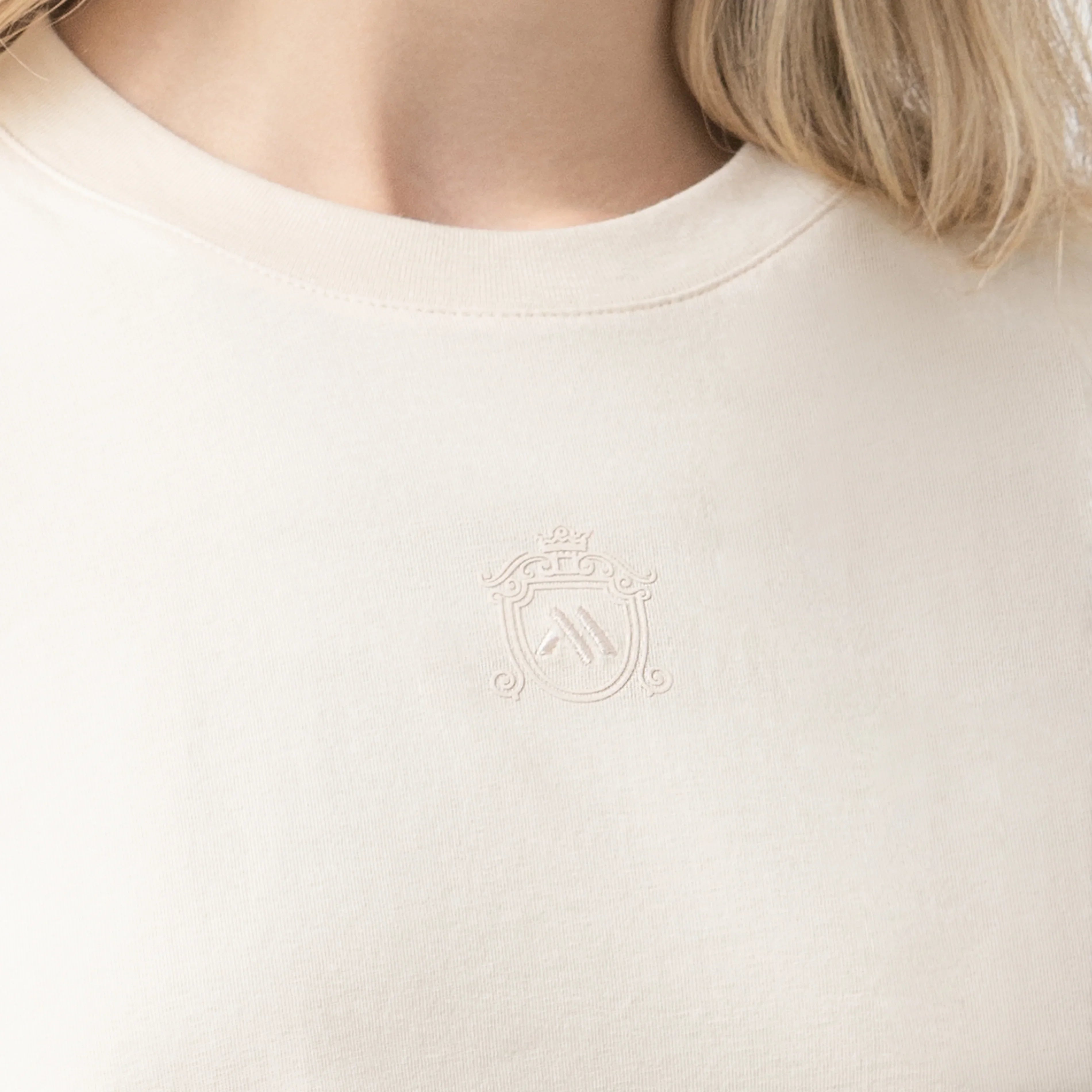 En el frente, destaca un escudo aplicado en estampado de alta densidad junto al logo bordado en hilo plano, aportando identidad, textura y un acabado artesanal. En la espalda, un estampado plano tono a tono complementa el diseño con sutileza y refinamiento.