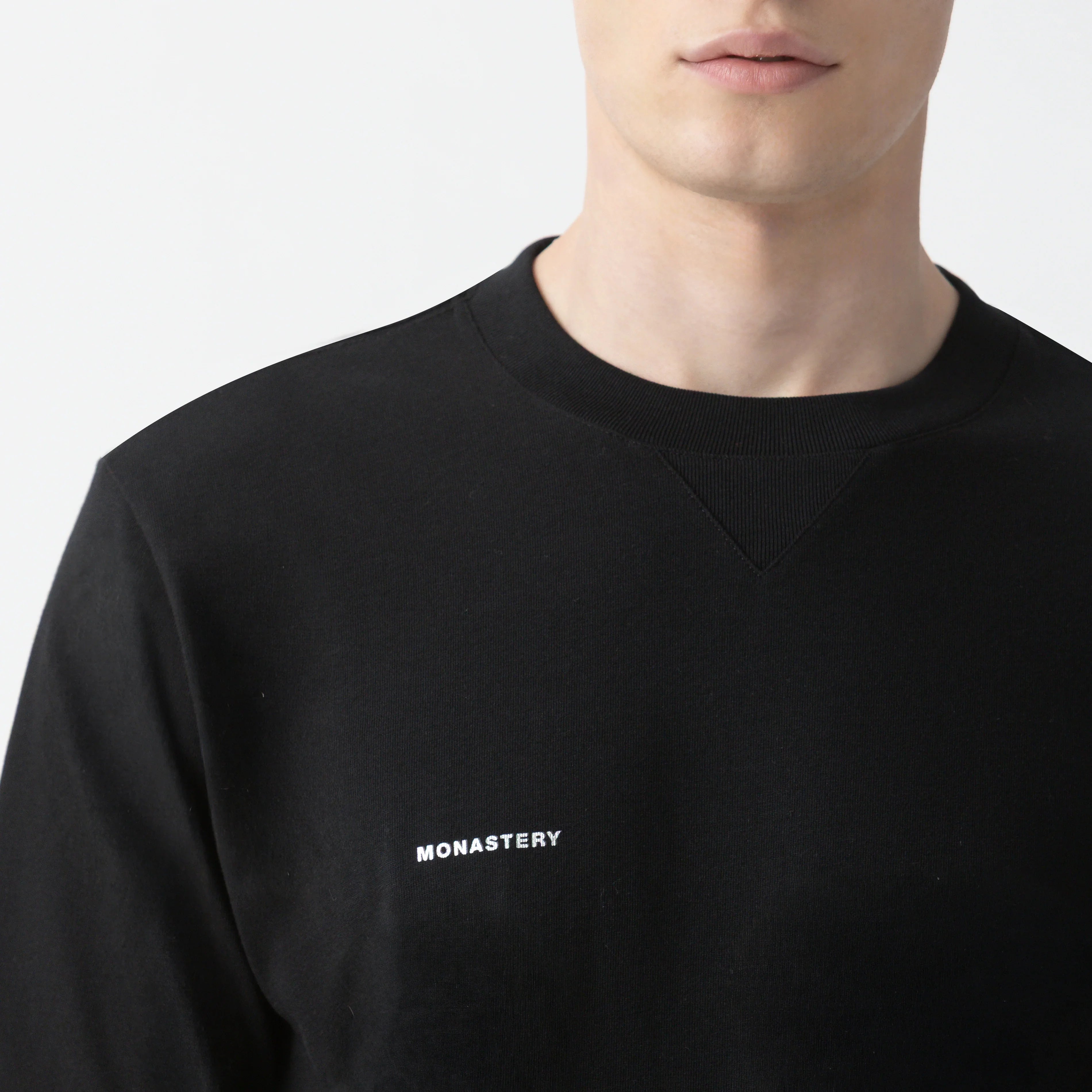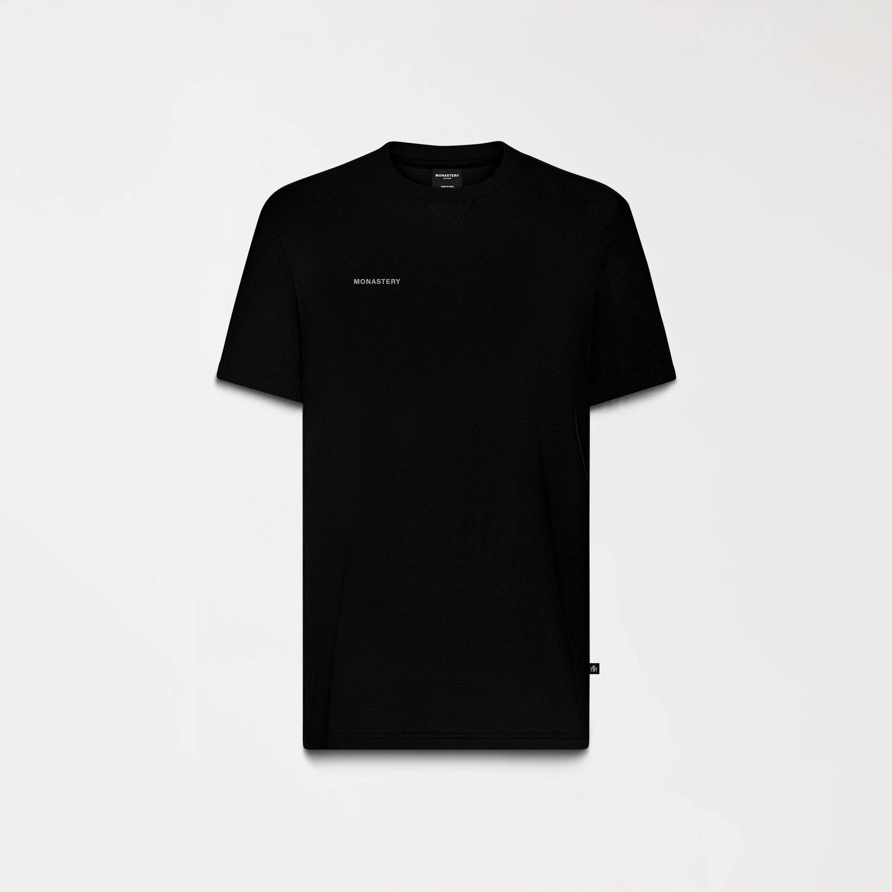 El logo Monastery, aplicado en técnica foil color plata tanto en el frente como en la espalda, aporta reflejos metálicos sutiles que elevan la presencia visual de la prenda.