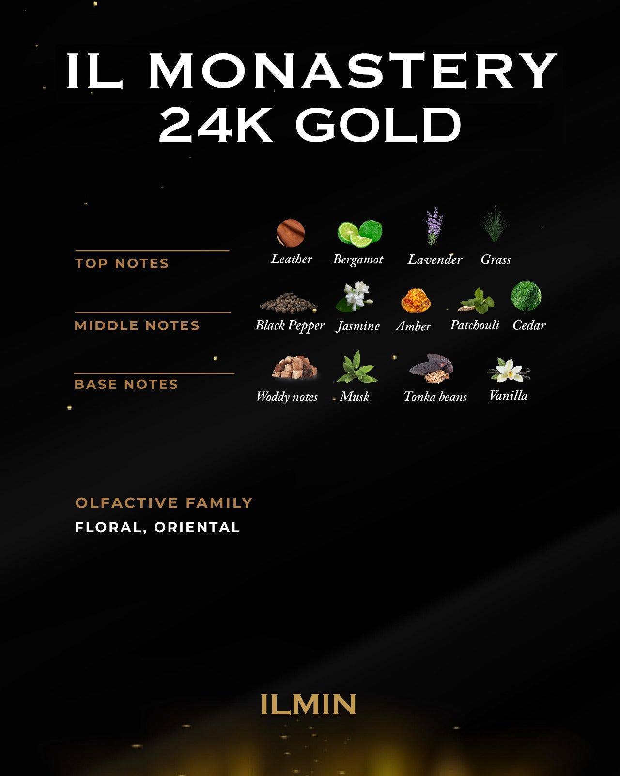 Fragancia Ilmin Monastery 24k gold unisex, una armoniosa combinación de canela, lavanda, y bergamota en las notas de entrada. En las notas medias, la pimienta negra, jazmín, ámbar y cedro te envuelven en un aroma sensual y misterioso. Las notas base, amaderadas, habas de tonka y vainilla, cierran esta experiencia con un toque cálido y encantador.