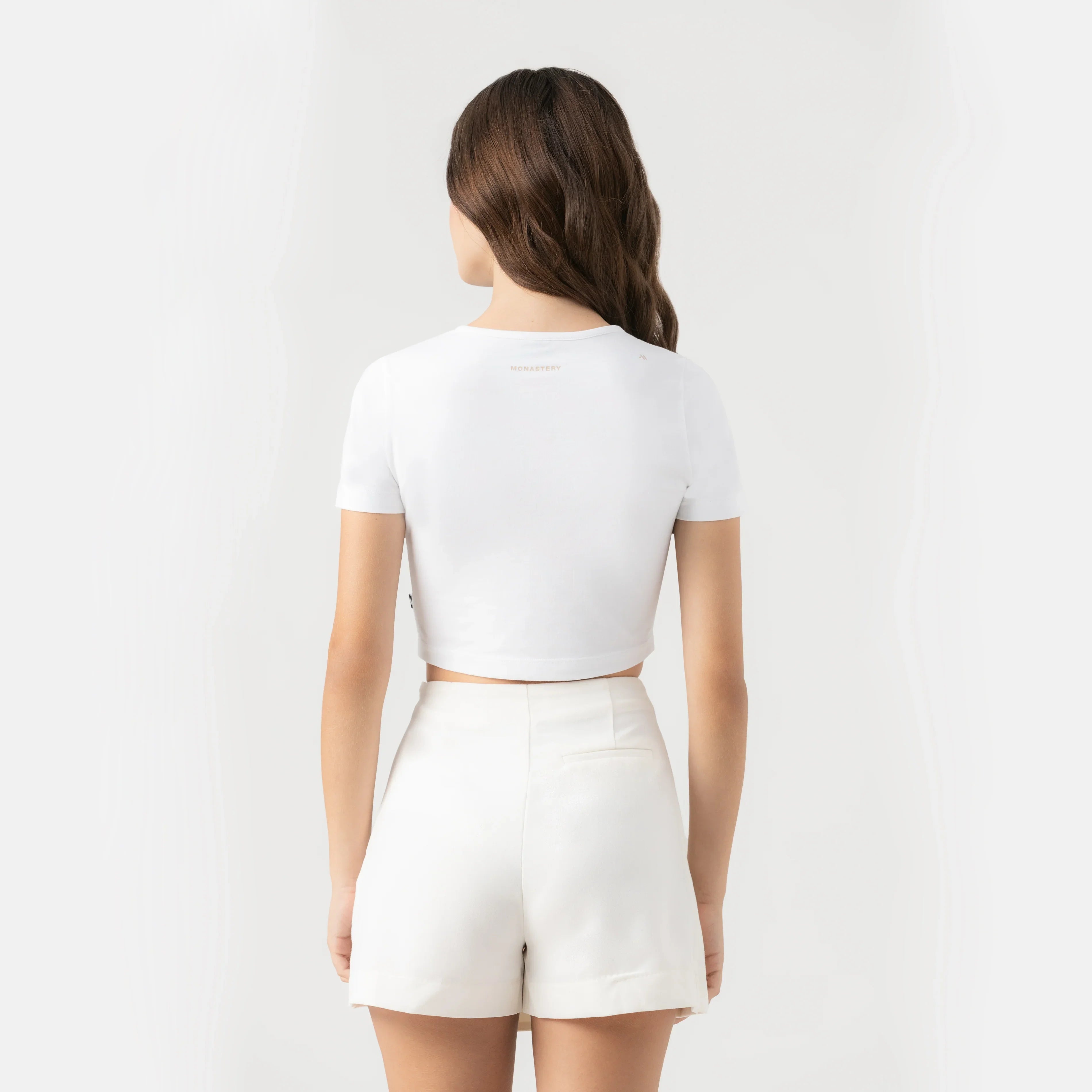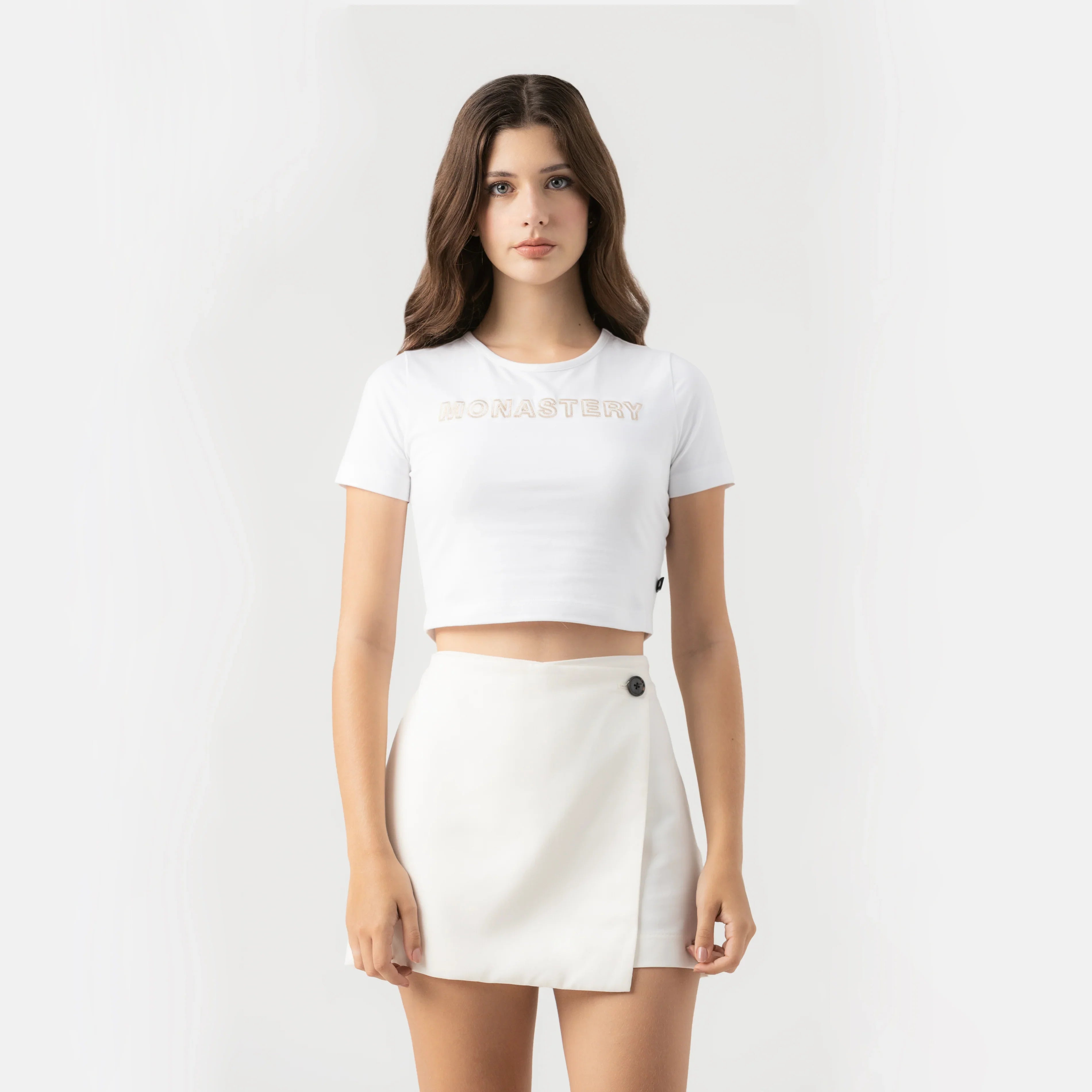 Kaia es un crop top femenino de silueta corta con cuello en sesgo, diseñado para realzar la figura. Confeccionado en una base textil fresca y ajustada, combina comodidad con sofisticación. El frente destaca con el logo Monastery en técnica de bordado con efecto cuerda, mientras que la espalda incorpora los logos insignia en estampado plano, reforzando su carácter distintivo. Una prenda versátil que aporta identidad y estilo en cada ocasión.