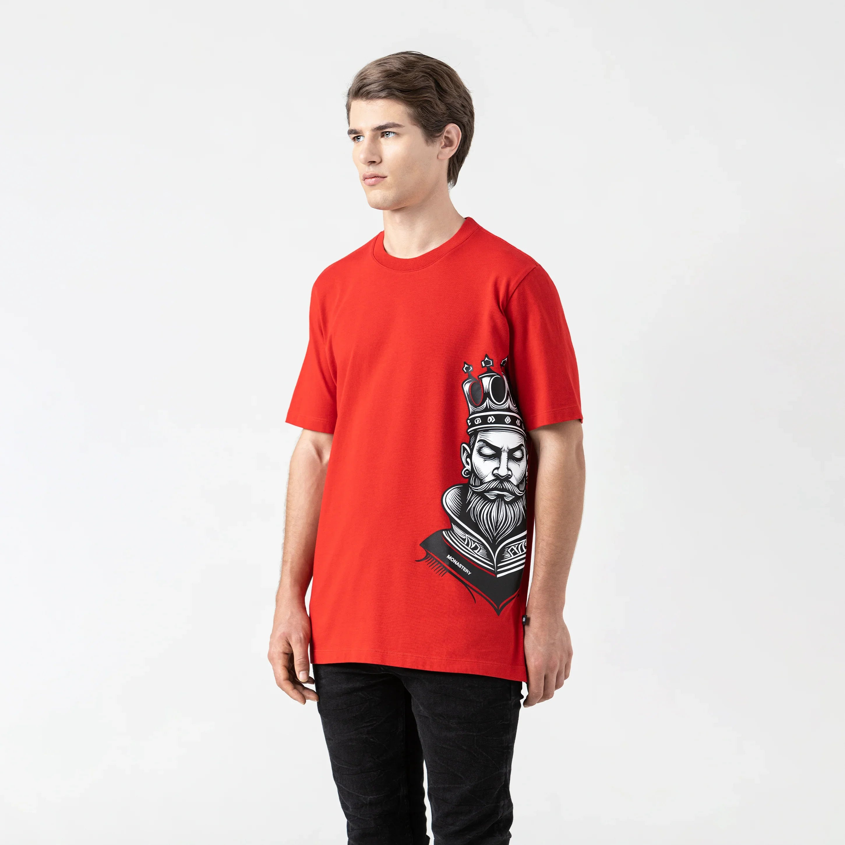 Es una camiseta masculina de silueta regular que transmite fuerza y precisión en cada detalle. Confeccionada en te Monastery, ofrece una estructura firme y un tacto suave, ideal para un fit cómodo y con presencia. El diseño incluye un cuello en rib de 2.5 cm que refuerza su carácter. En el frente y la espalda, se destacan estampados en plastisol con acabado mate tipo transfer, que aportan una textura sutil y una estética de bajo brillo, ideal para quienes prefieren una gráfica sofisticada sin exceso de brillo. Una prenda que combina técnica y estilo para un look que impone respeto sin esfuerzo.