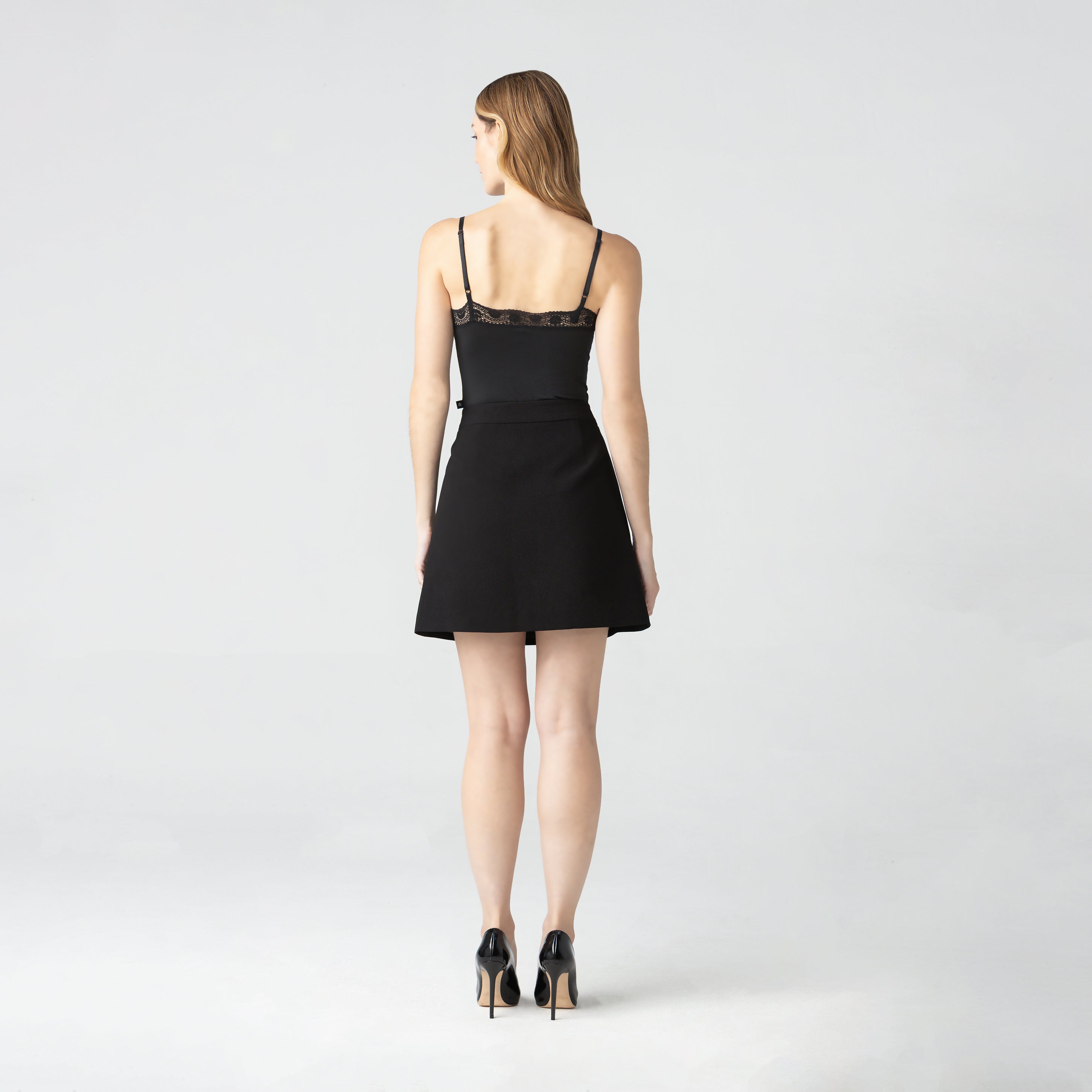 Falda corta de silueta estructurada, diseñada para ofrecer una propuesta versátil y contemporánea. Su estética minimalista se distingue por una caída limpia y un ajuste preciso, que realzan la figura con equilibrio y sofisticación.