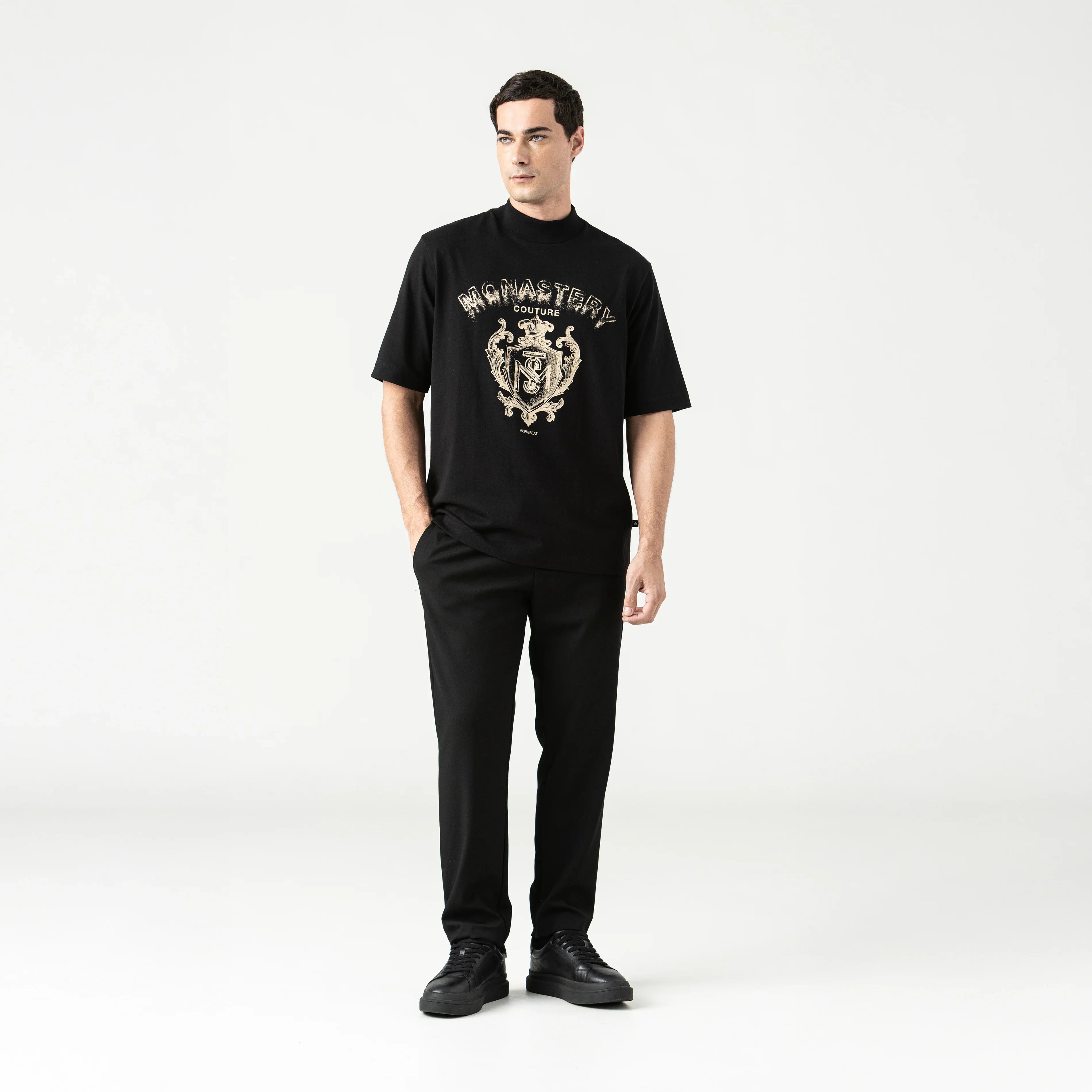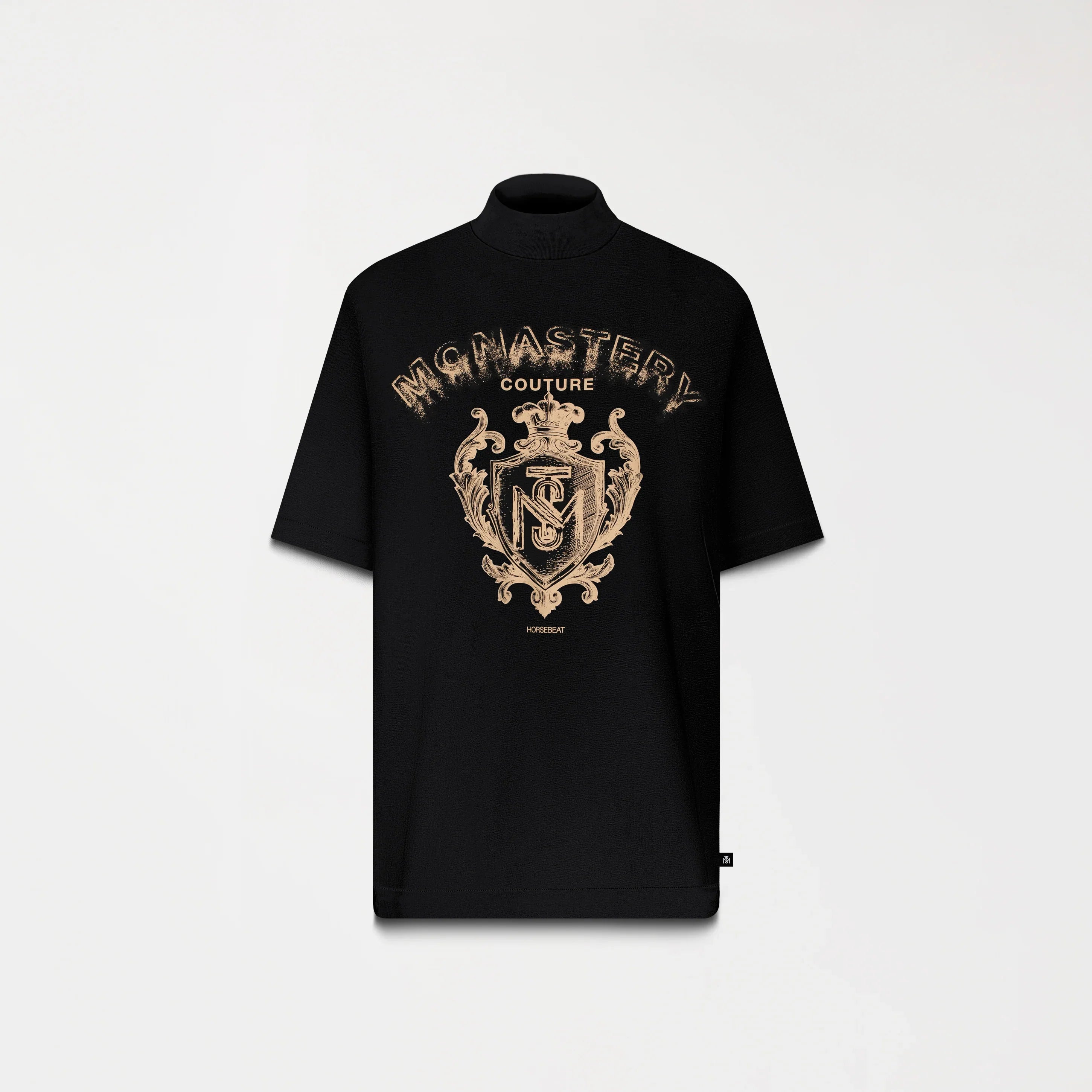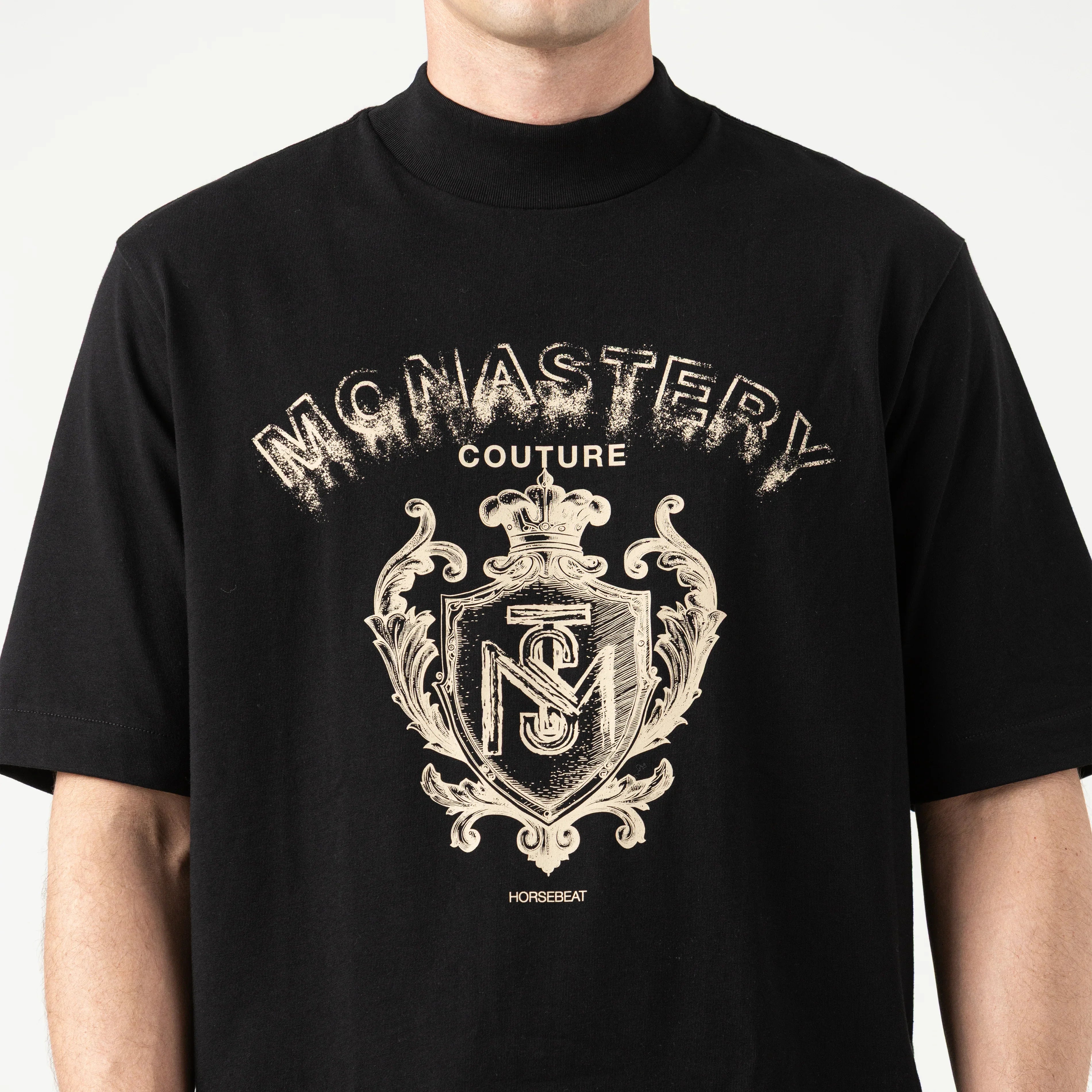 Sheval es una camiseta masculina. Esta camiseta de silueta oversized y cuello en rib de 5 cm está confeccionada en nuestra exclusiva tela Monastery 100% algodón, que ofrece estructura, suavidad y un fit relajado con carácter. El frente presenta un estampado plano con un diseño de escudo Monastery, símbolo de fuerza, legado y estilo atemporal. En la espalda, un estampado en alta densidad aporta textura y profundidad, cerrando una propuesta visual potente y equilibrada. Ideal para quienes visten con intención y confianza.