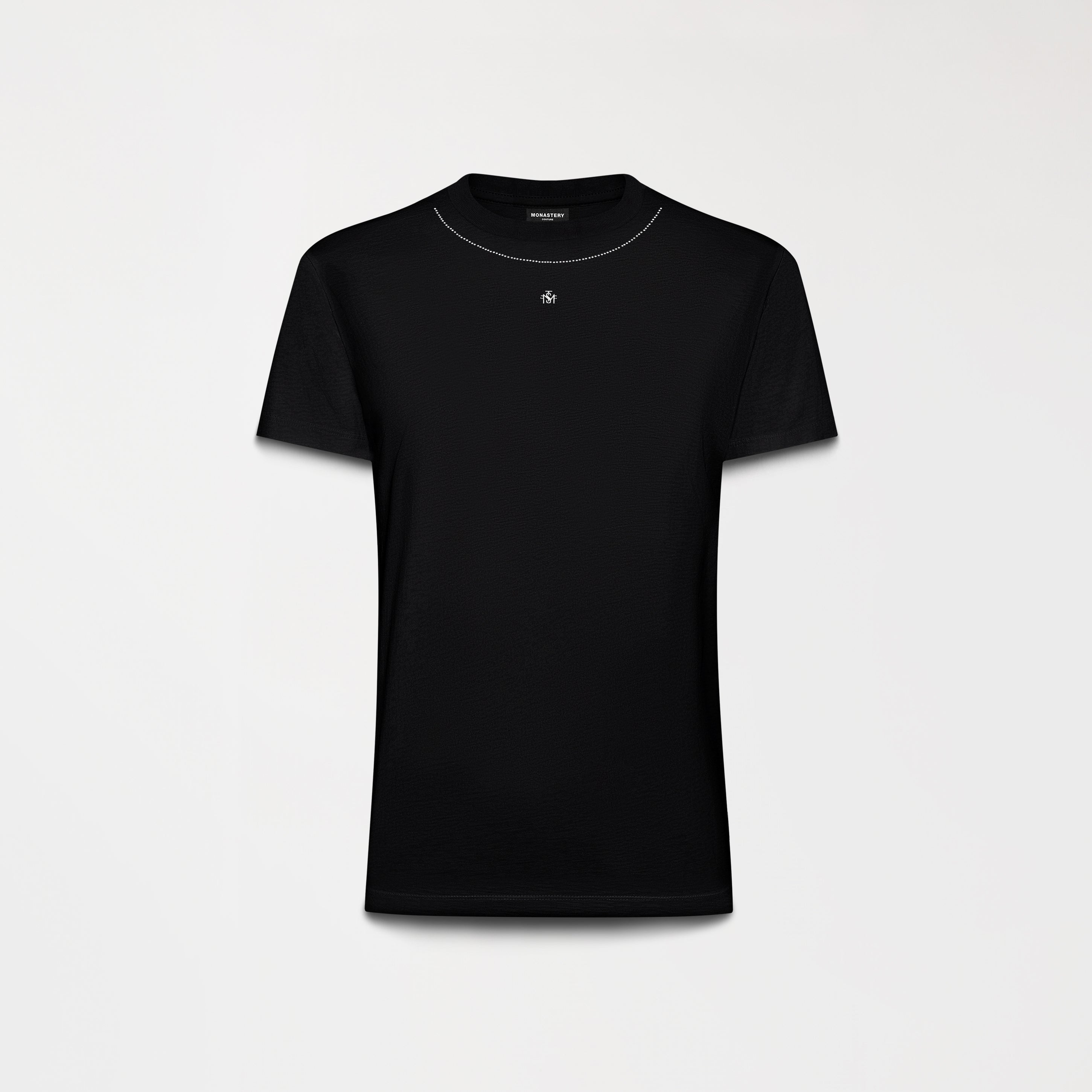 T-shirt femenina de silueta ajustada, diseñada para realzar la figura con una estética sofisticada y atemporal. Incorpora un delicado contorno de cristales en el cuello, tanto en el frente como en la espalda, que aporta un brillo elegante y sutil.