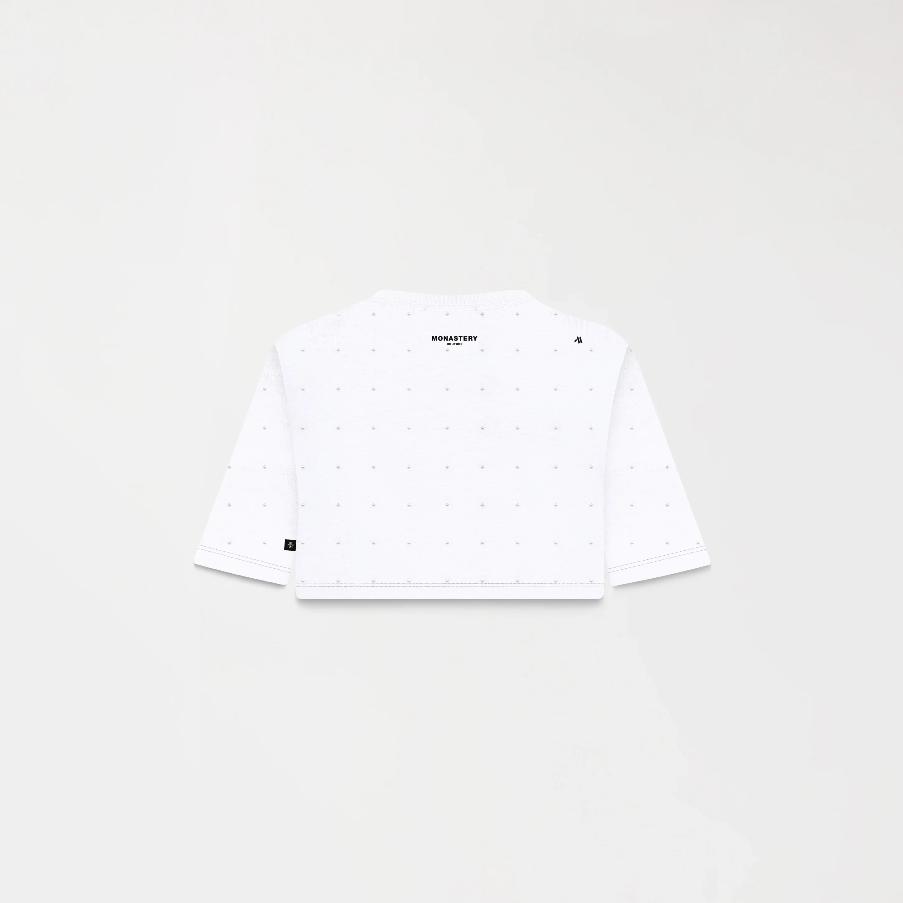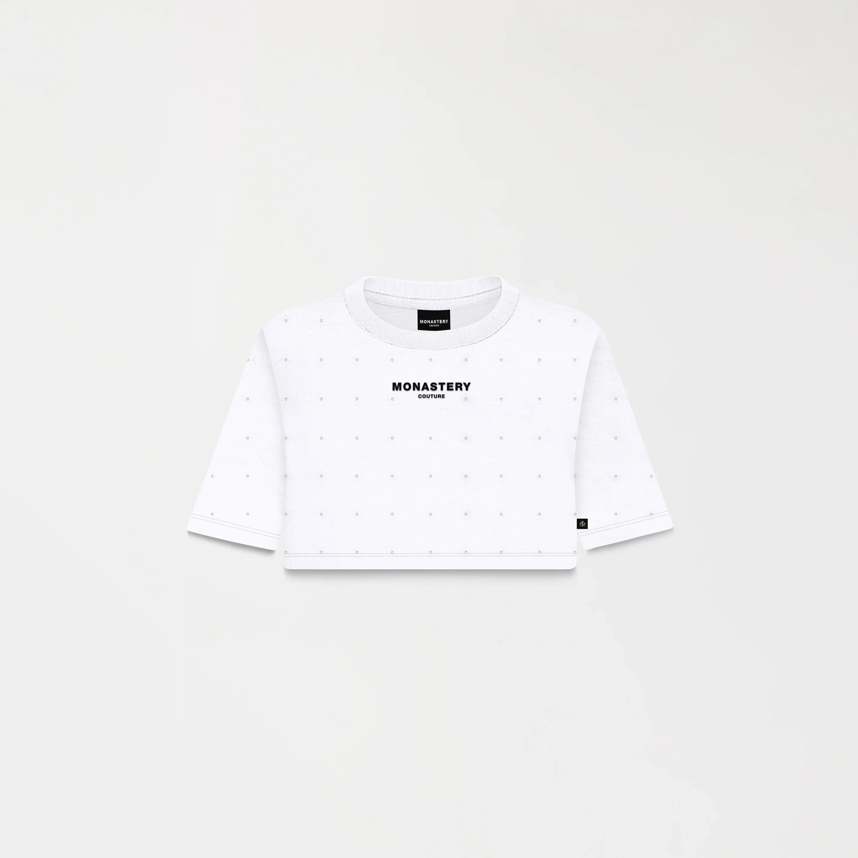 Sora es un crop top femenino en algodón 100% exclusivo para Monastery, de silueta pequeña. La prenda se distingue por una intervención con cristales dispuestos de manera continua y precisa, creando un efecto dinámico y luminoso. En el frente, el logo Monastery Couture en técnica transfer refuerza el contraste visual sin restar protagonismo al diseño, mientras que en la parte posterior, los logos insignia en estampado plano aportan un detalle de identidad sutil y elegante. Una pieza pensada para destacar con sofisticación y presencia.