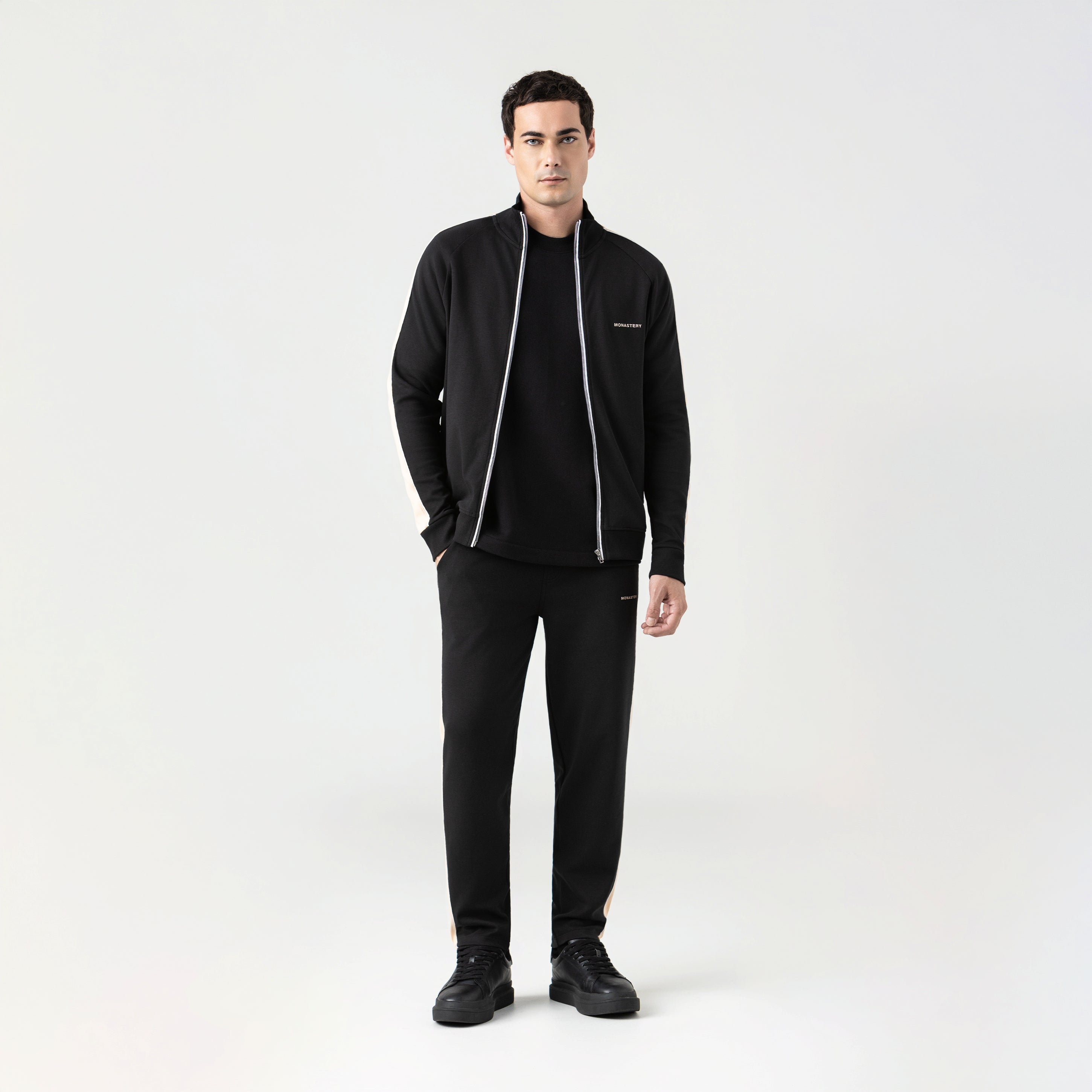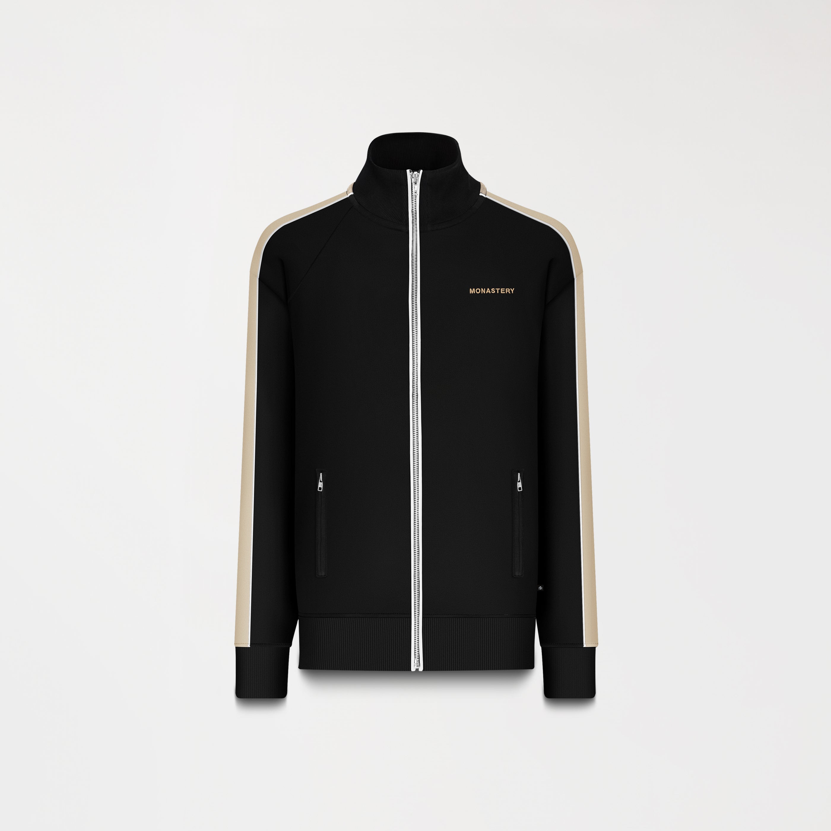 Tormain, diseñada con una estructura limpia y contemporánea, la chaqueta presenta bolsillos con cremallera y el bordado del logo Monastery, acompañado de un estampado en alta densidad en la espalda que aporta un carácter sutil pero inconfundible.