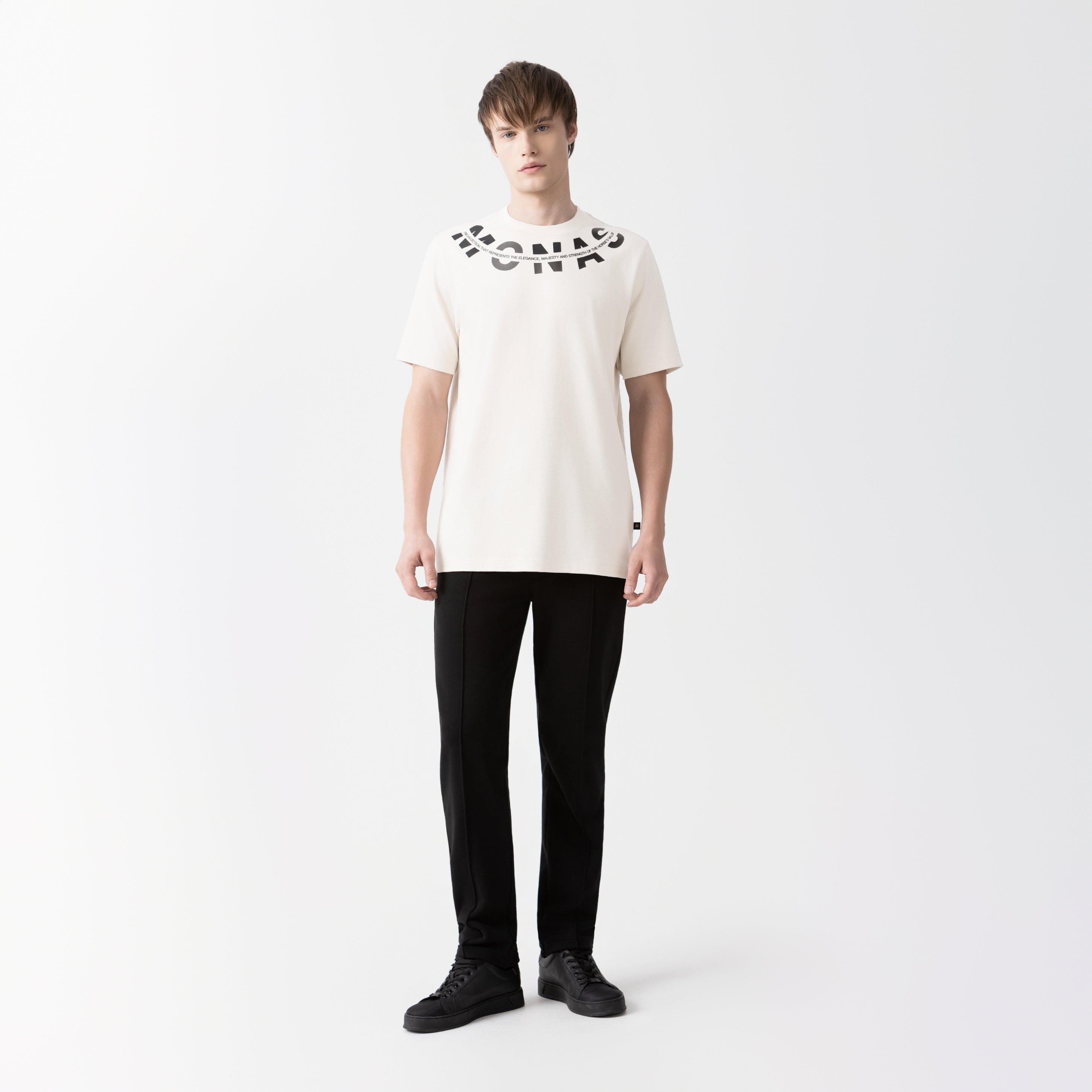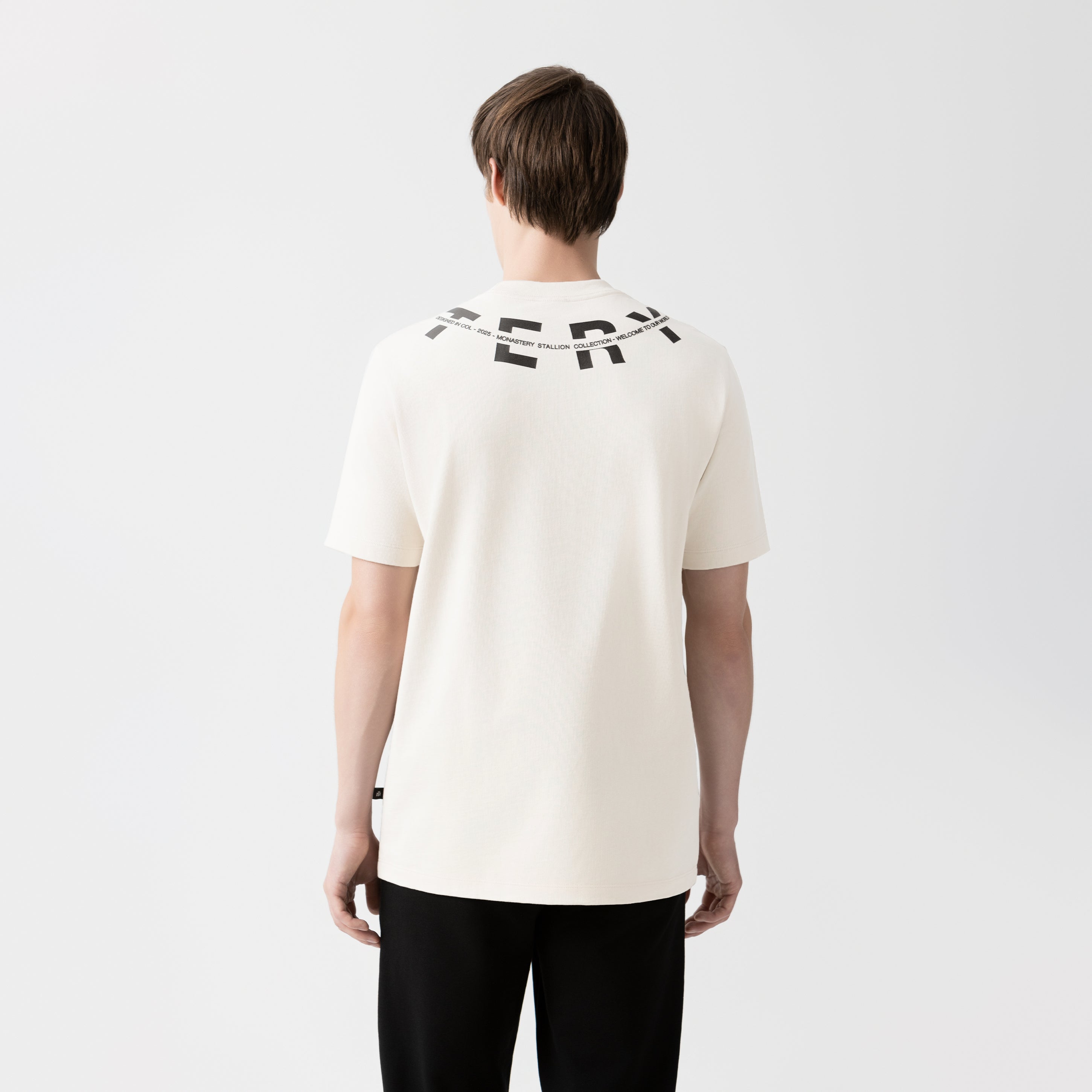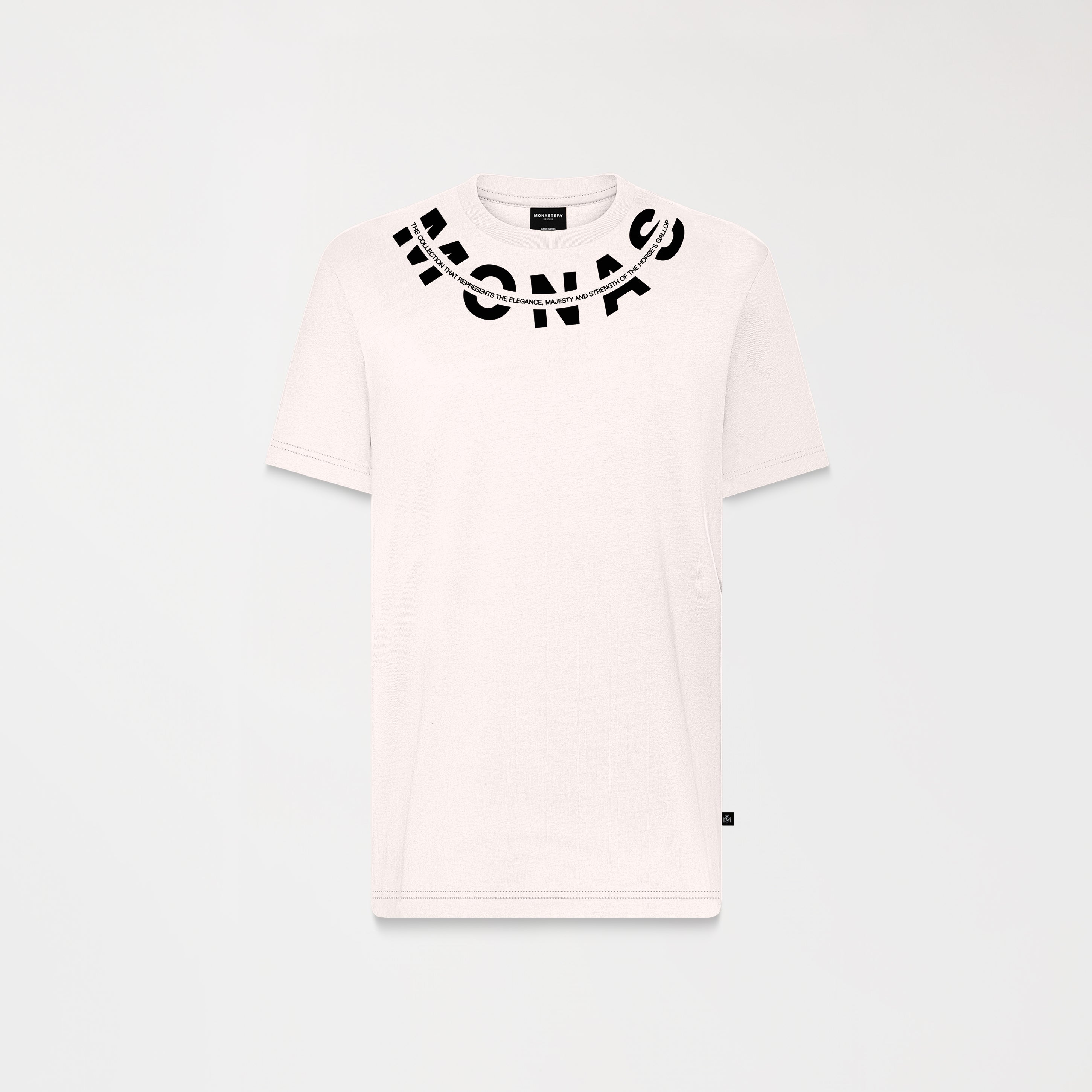 Utah es una T-shirt masculina confeccionada en 100% algodón ultra siliconado de alta calidad, que ofrece una textura suave y un acabado refinado. En el frente y la parte posterior, los artes se aplican en estampado plano combinando transfer mate —para un efecto sin brillo— y alta densidad, que aporta volumen y relieve táctil. El diseño presenta la palabra Monastery distribuida estratégicamente entre ambas caras, generando una continuidad gráfica envolvente que refuerza la identidad visual de la marca.