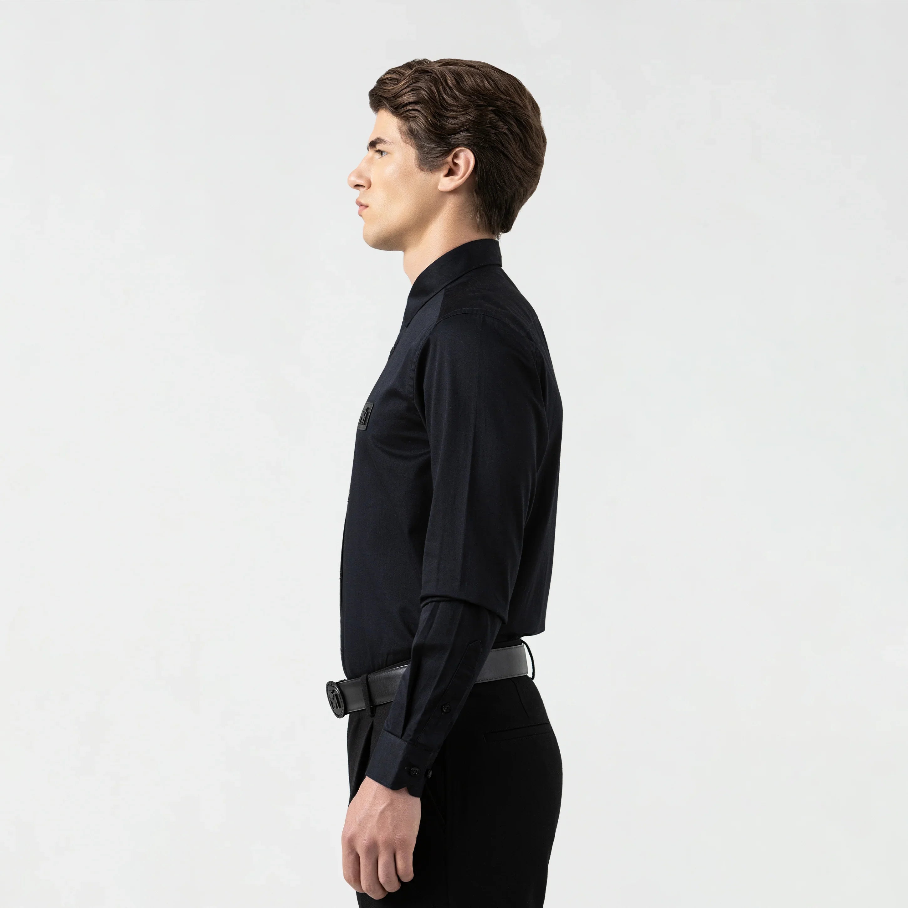 Yoshiro es una shirt masculina manga larga. Minimalista y con carácter, la shirt Yoshiro está confeccionada en suave algodón con elastano para un ajuste cómodo y fluido. Su silueta regular se complementa con un aplique metálico en el frente que aporta un toque moderno y distintivo. El logo insignia se revela discretamente en un bordado interno sobre la perilla, mientras el estampado en alta densidad en la espalda acentúa su identidad. Ideal para quienes buscan una prenda versátil con una estética limpia, tanto en contextos formales como casuales.